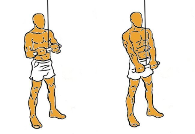 Posición inicial de pie, con los pies separados a la altura de las caderas, la espalda recta y las rodillas flexionadas. Ambas manos aferradas a una barra conectada a una polea alta, los brazos apretados contra el pecho. Extienda los brazos a la extensión completa y luego regrese a la posición inicial. Solo el antebrazo debe moverse durante la ejecución del ejercicio y los codos deben permanecer pegados a los costados.